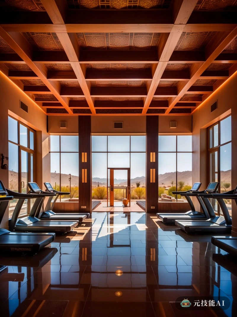 Imagine serving as a modern lighthouse in the vast desert, the Desert Oasis Fitness Center stands to demonstrate the integration of traditional Mughal architecture with contemporary design principles. The center is located in a dry landscape, providing an opportunity for breathing in harsh environments and also a shelter for good health. The exterior of the fitness center is a structurally honest study, with titanium metal panels surrounding the building, reflecting dazzling sunlight and seamlessly blending with the natural color palette of the desert. These panels are arranged in a cluster layout, echoing the dense urban structure of the Mughal city while maintaining openness and ventilation. As soon as you enter the door, what catches your eye is a hall that exudes luxury and a sense of tranquility. The high ceiling is decorated with intricate Mughal style patterns, supported by smooth titanium columns, combining traditional elegance with modern functionality. The floor is covered with soft carpets, creating a comfortable contrast with the hard exterior. The fitness center is equipped with the most advanced equipment, including a treadmill, a weightlifting station, and a functional training area. The design of these spaces prioritizes natural lighting, with large windows allowing for prime time sunlight to project warm rays inside the titanium metal. The Desert Oasis Fitness Center also offers various group sports courses, including yoga, Pilates, and dance, all conducted in well ventilated rooms. These spaces are decorated with hanging artworks inspired by Mughal miniature models, further promoting the theme of cultural integration. The center also has a spa and sauna area, where members can relax and recover from strict exercise. The interior design of these spaces is a minimalist study, with soft lighting, water features, and abundant natural plants, creating a peaceful and serene atmosphere. The Desert Oasis Fitness Center is not just a place for fitness; This is an experience that combines the best traditional Mughal architecture with modern design principles, providing a unique fusion of fitness, relaxation, and cultural immersion in the heart of the desert.masterpiece,best quality,high resolution,high detail,