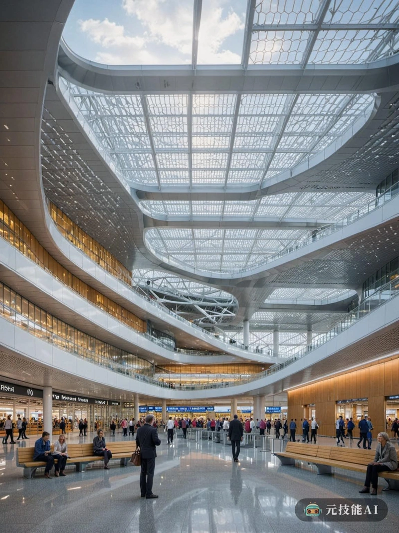 在这幅图中,我们看到一个由当代建筑大师理查德·罗杰斯设计的机场。场景发生在航站楼的中心,天花板高耸入云,由钢梁晶格支撑。自然光透过缝隙,在光滑的白色内部投射出柔和的光芒。设计简约而实用,弯曲的墙壁和圆角优雅地引导着旅行者。终端是一个活动的蜂巢,但设计确保了一种平静和轻松的感觉。寻路标志、光滑的长椅和现代艺术装置等细节增加了整体体验。罗杰斯的愿景很明确:创造一个不仅仅是机场的空间,而且本身就是一个目的地。