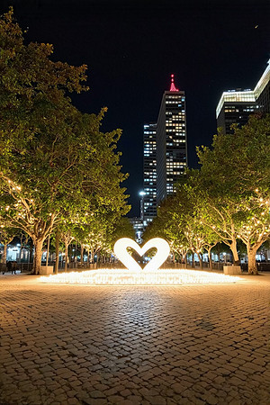The image depicts a beautifully lit plaza in the evening, surrounded by tall buildings. The plaza features a stunning light installation that forms a heart shape, casting a warm glow on the pavement. The trees in the area are adorned with small lights, adding a touch of magic to the scene. The overall style of the plaza is modern and minimalist, with clean lines and a neutral color palette. The lighting enhances the architectural elements of the space, creating a sense of depth and dimension. The weather appears to be clear and dry, with no signs of rain or storms. The lighting installation is a key element of the plaza's design, drawing visitors in and creating a sense of wonder and delight.