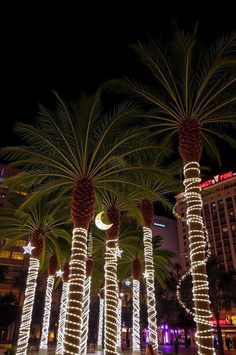 A city square is adorned with festive lights wrapped around palm trees, creating a warm and inviting atmosphere. The lights are in the shape of spirals, stars, and moons, adding a touch of magic to the urban landscape. The buildings in the background are also lit up, adding to the overall festive feel of the scene. The sky is dark, indicating that it's nighttime, and the palm trees sway gently in the breeze.