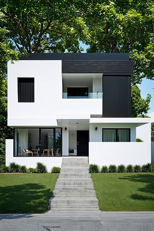 A modern house with a white exterior and a black roof. The house has three floors and a small balcony on the second floor. The walls are made of concrete and the eaves are made of wood. The house is surrounded by trees and a lawn. The house is located in a residential area with other houses and cars. The sky is blue and clear.