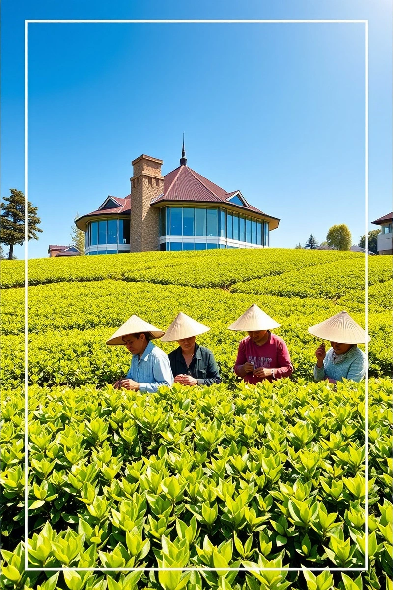 四个人戴着圆锥形的帽子,在一片绿油油的茶园里收割茶叶。在背景中,可以看到一座现代化的两层建筑,带有尖顶和玻璃幕墙。这座建筑是用石头建造的,一侧有一个形状独特的塔。天空是蓝色的,阳光灿烂。这幅图像被一层薄薄的白色边框框起来。