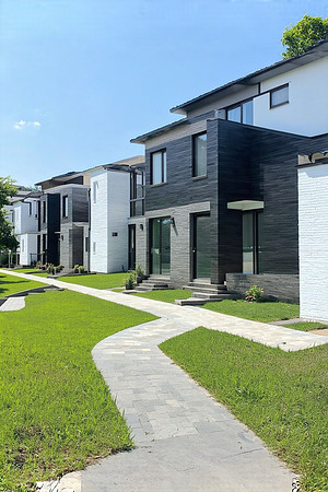 A row of houses with a sky background. The houses are made of grey and white bricks and black and white walls. There are small green lawns between the houses and a path made of grey tiles leads to the entrance of each house. The houses have large windows with black frames and shutters. The sky is blue with white clouds.