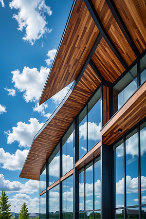 现代建筑的外观,有一个大的悬挑,以木材和玻璃元素为特色。天空是蓝色的,有缕缕云。