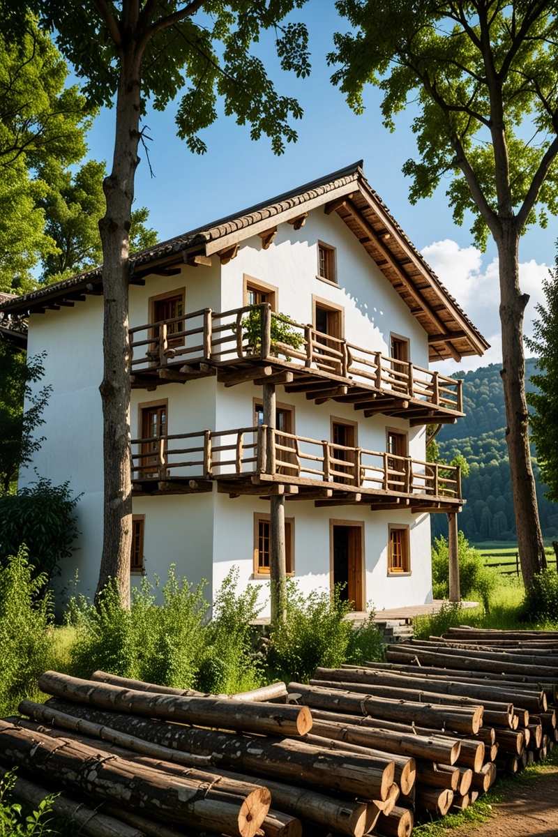 A white building with a wooden roof and large wooden pillars. The roof is supported by thick wooden beams, creating a rustic and traditional style. The building is situated in a lush green environment, surrounded by trees and shrubs. The sky is clear and blue, indicating a sunny day. The image also features a pile of logs in the foreground, adding to the rural atmosphere.