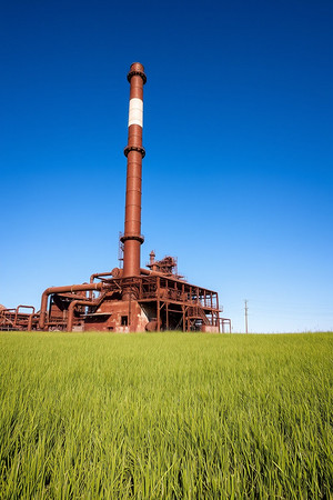 郁郁葱葱的绿色田野上隐约可见一座锈迹斑斑的废弃工厂。天空是湛蓝的。这景色与自然和人造形成鲜明对比。工厂的管道和结构是其工业历史的证明。草地生机勃勃,绿油油的,仿佛与工厂的衰败形成了鲜明的对比。这幅图提醒人们时间的流逝和行业的变化。