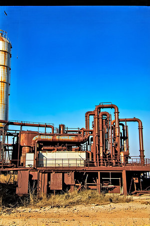 一个废弃的工厂,生锈的管道和机器矗立在蓝天的衬托下。这座建筑是钢制的,左边有一个大水塔。这景色给人一种荒凉和被遗弃的感觉。