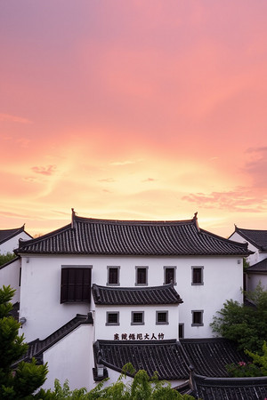 图中是一座传统的中国四合院,位于安徽省的一个老城区。房子是白墙灰顶,具有中国古典建筑风格。这张照片是在太阳下山的时候拍摄的,营造了一种温暖而宁静的氛围。天空是粉红色和灰色的云的混合,房子周围是郁郁葱葱的绿色植物。整体形象风格宁静如画,四合院为中心元素。图为安徽省一座传统的四合院