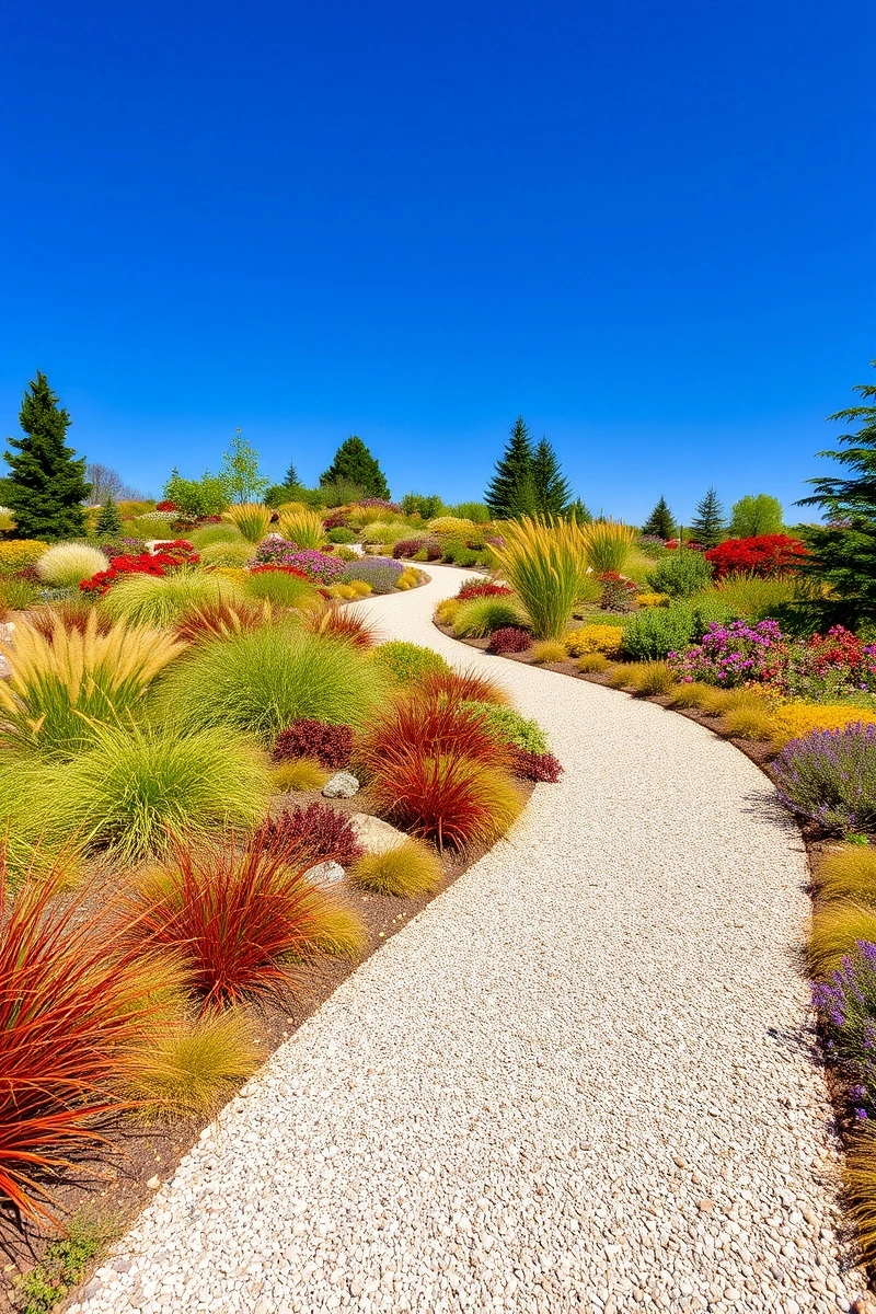A winding gravel path leads through a colorful, landscaped garden. The sky is blue and sunny. The garden features a mix of grasses, shrubs, and flowers in a variety of colors including red, orange, and purple. There are also trees of different heights scattered throughout the landscape. The overall style is natural and organic, with a focus on creating a diverse and thriving ecosystem. The gravel path winds through the garden, providing a sense of movement and exploration. The vibrant colors and lush greenery create a sense of energy and life.