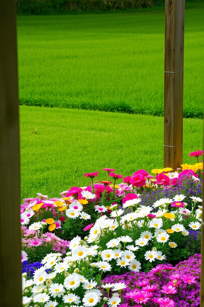 A well-maintained garden with colorful flowers and a green lawn, framed by wooden fence posts. The garden is located next to a lush green field, and the flowers include white, pink, yellow, and purple blossoms. The garden is surrounded by a wooden fence, and the flowers are arranged in a symmetrical pattern. The image captures the beauty of nature and the art of gardening.