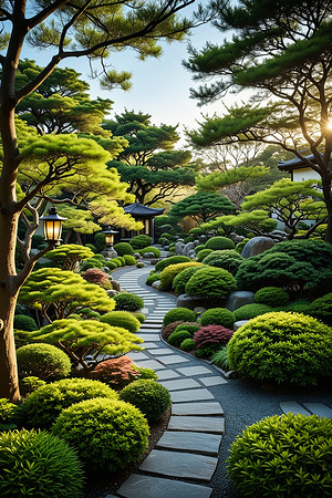 一个宁静的日式花园,修剪整齐的草坪和弯曲的小路。花园以各种灌木和树木为特色,包括一棵大松树,并装饰着装饰性的灯笼。这座带有黑色窗框的现代风格建筑坐落在花园的边缘。天空是清澈的蓝色,整个氛围是和平和宁静的。