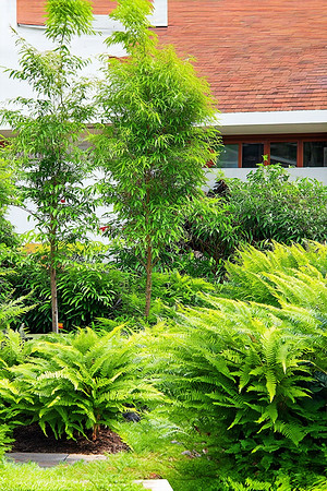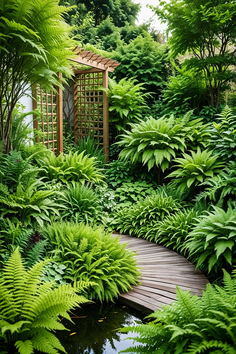 A well-maintained garden with a variety of plants, including ferns, shrubs, and small trees. The garden is filled with greenery and is adjacent to a building. The plants are arranged in a way that creates a natural and relaxing atmosphere. The garden features a unique wooden trellis and a small pond. The overall style of the garden is eclectic, incorporating elements of both traditional and contemporary design. The garden is a perfect example of how plants can be used to enhance the aesthetic of an urban environment.