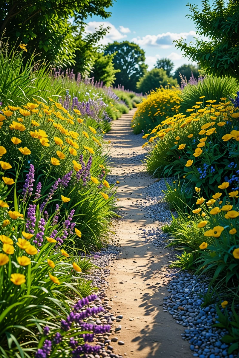 一条砾石小径蜿蜒穿过一个充满活力的花园,花园里开着黄色和紫色的花,高大的灌木和绿色的草地。天空是湛蓝的。